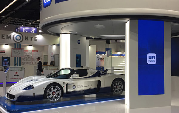 The link between tradition and high technology is highlights by the layout of the UFI booth and by the presence of the sports car Maserati MC12, the limited production car branded with UFI Filters personalisation and fitting UFI products.